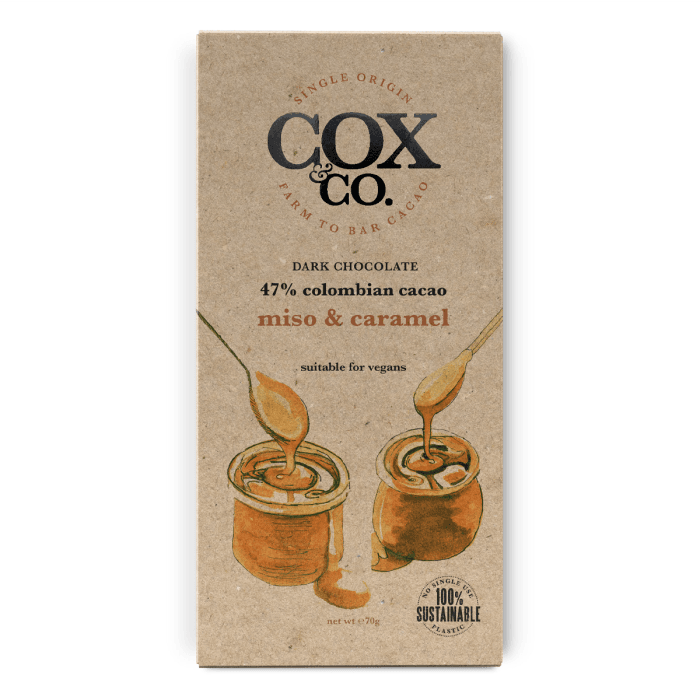 A sophisticated twist on indulgence, this handcrafted Miso & Caramel Single Origin Oat Chocolate Bar, from Cox&Co, combines the smooth creaminess of oat-based chocolate, with the rich complexity of single-origin cacao.