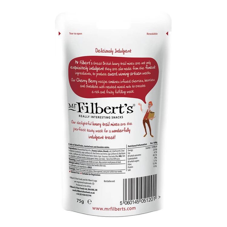 Mr Filberts Cherry Berry Chocolate & Nut Mix (75g) additional 1Mr Filberts Cherry Berry Chocolate & Nut Mix (75g) additional 2Mr Filberts Cherry Berry Chocolate & Nut Mix (75g) additional 3Mr Filberts Cherry Berry Chocolate & Nut Mix (75g) additional 4