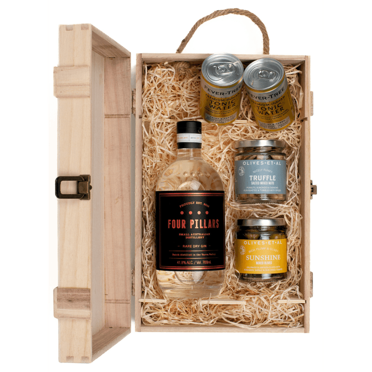 Open the ultimate gin - infused indulgent with the Four Pillars Rare Gin & Luxury Nibbles Wooden Gift Box Set! This great gift box set includes a bottle of Four Pillars Rare Gin, which pairs beautifully with the two bottles of premium tonic water, creating the perfect G&T. The wooden rustic gift box makes for a special gift to give, as each component has been carefully placed and selected to ensure your recipient loves it. This gift set also comes with two moreish savoury snacks, from Olive Et Al, to indulge in.