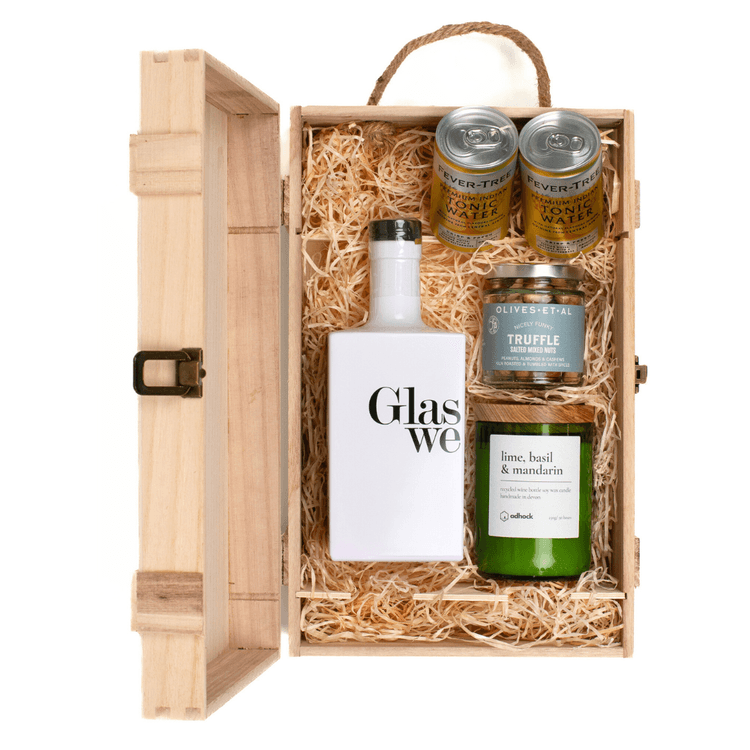 This special gift wooden hamper makes the perfect treat! Including a bottle of Glaswegin Original Gin, along with two 150 ml cans of Fever Tree Premium Indian Tonic Water, this set creates the perfect G&T creation.