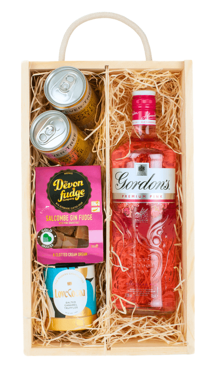 Do you know someone who absolutely adores Pink Gin? If so, we have the perfect gift for the ultimate girly gin experience, whether it's Christmas or her birthday. Introducing our Gordon's Pink Gin & Luxury Nibbles Wooden Gift Box Set, the ultimate delight for Pink Gin enthusiasts. This beautifully packaged wooden gift box holds a full-size bottle of Gordon's premium Pink Gin, a taste sensation that's both vibrant and refreshing. But the fun doesn't stop there – we've thoughtfully included two tonic waters that harmonise perfectly with the Pink Gin. To make it even sweeter, there are a few delectable treats that she'll absolutely adore.