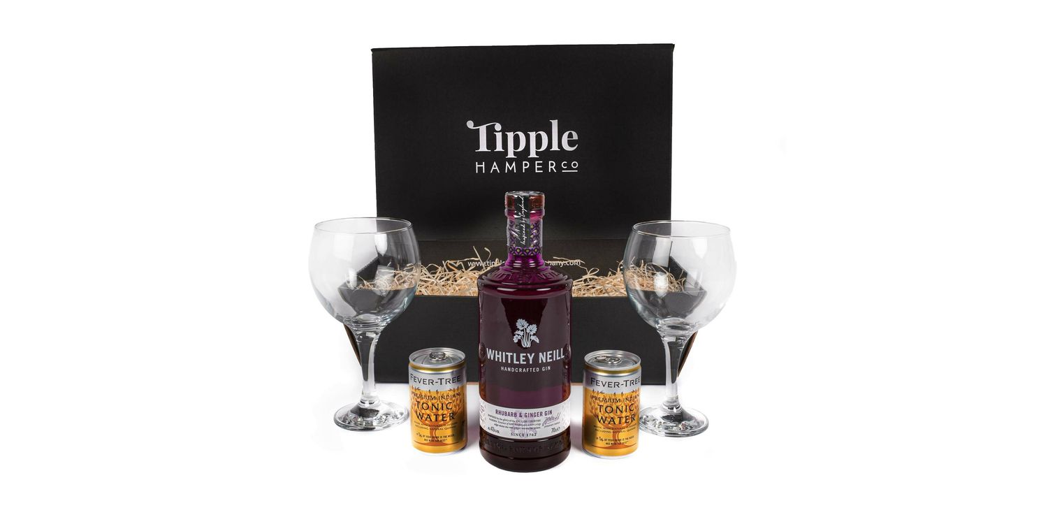 Get the perfect blend of crisp rhubarb essence and warming ginger with the Whitley Neill Rhubarb & Ginger Gin, Tonic & Glasses Gift Set Hamper.
