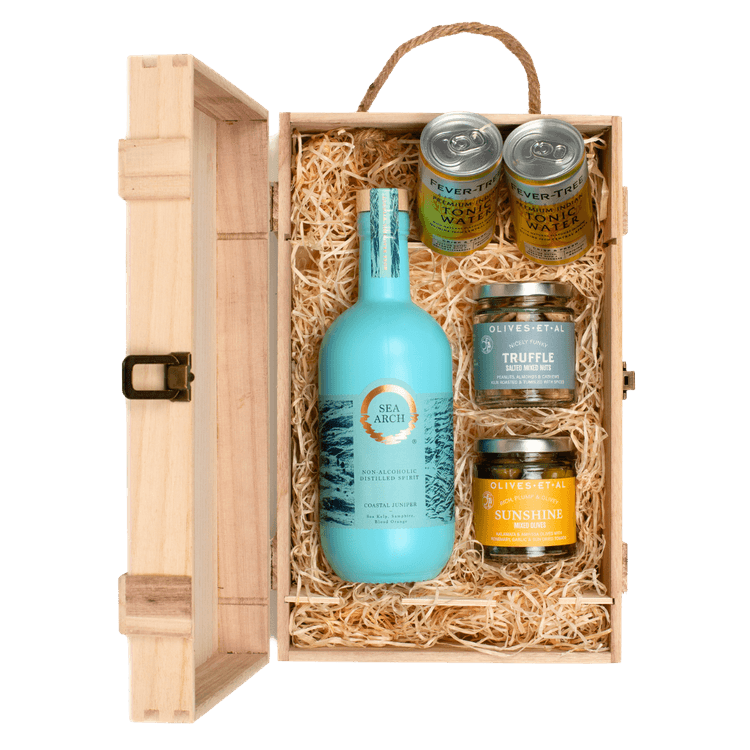 There is no need to compromise on luxury for an alcohol fee gift set. This Sea Arch (Non-Alcoholic) Spirit & Luxury Nibbles Wooden Gift Box Set shows how any spirit, even non - alcoholic ones, can show elegance and sophistication. This inviting set captures the essence of the sea with botanical complexity, accompanied by two cans of Fever-Tree Premium Indian Tonic Water to easily mix your self a drink, as well as a selection of moreish nibbles, meticulously curated to complement the spirit's flavours.