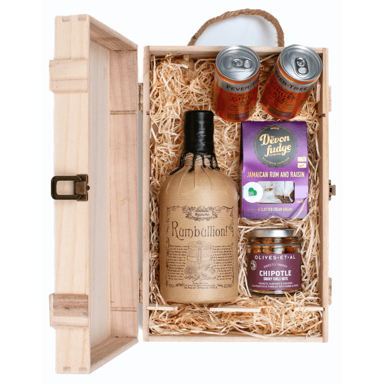 For the ultimate rum experience, unbox the Rumbuillion! Rum & Luxury Nibbles Wooden Gift Set! This exquisite wooden gift box set combines the finest selection of premium rum and delectable nibbles, perfect for those who appreciate the finer things in life. Crafted with care, each element is curated to create a sophisticated sensory experience, making it an ideal gift for any connoisseur or a great treat for yourself. This gift set includes sweet and savoury moreish snacks, great for an evening of unwinding.