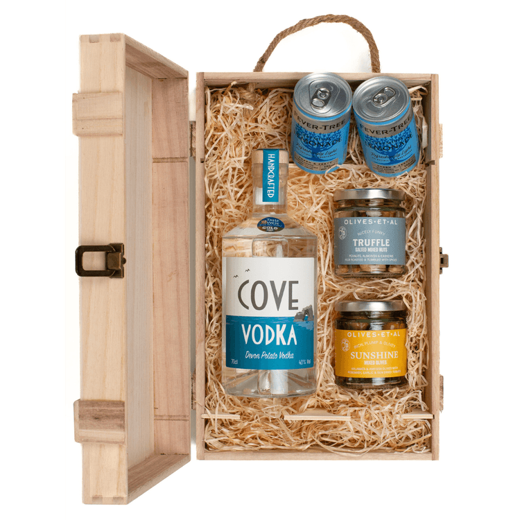 This Devon Cove Vodka & Luxury Nibbles Wooden Gift Box Set includes a great ensemble of treats to indulge in, for any occasion! Treat the senses to this array of goodies, all carefully selected and handpicked to guarantee luxury. Nestled in an exquisite rustic wooden gift box, this set epitomises indulgence. At its heart lies Devon Cove Vodka, a premium spirit, resulting in a velvety smooth taste and unparalleled purity. Each sip reveals layers of delicate flavours, with a clean finish that lingers on the palate. To compliment the spirit are selected savoury snacks from Olives Et Al, delivering a rich moreish indulgent taste. To pair with the vodka features two cans of tonic water, for a perfect combination.