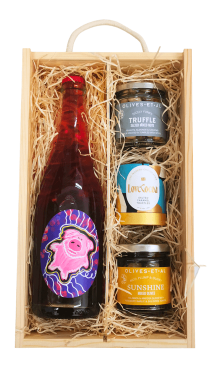 Discover our Piggy Pop Pet Nat Wine & Luxury Snacks in a Wooden Presentation Box – the perfect gift for any occasion. This set includes a full-size bottle of Piggy Pop Pet Nat Wine, bursting with fresh peachy flavour, and an assortment of delightful sweet and savoury treats. Whether it's for Christmas or a birthday, this delightful hamper is sure to delight and impress.